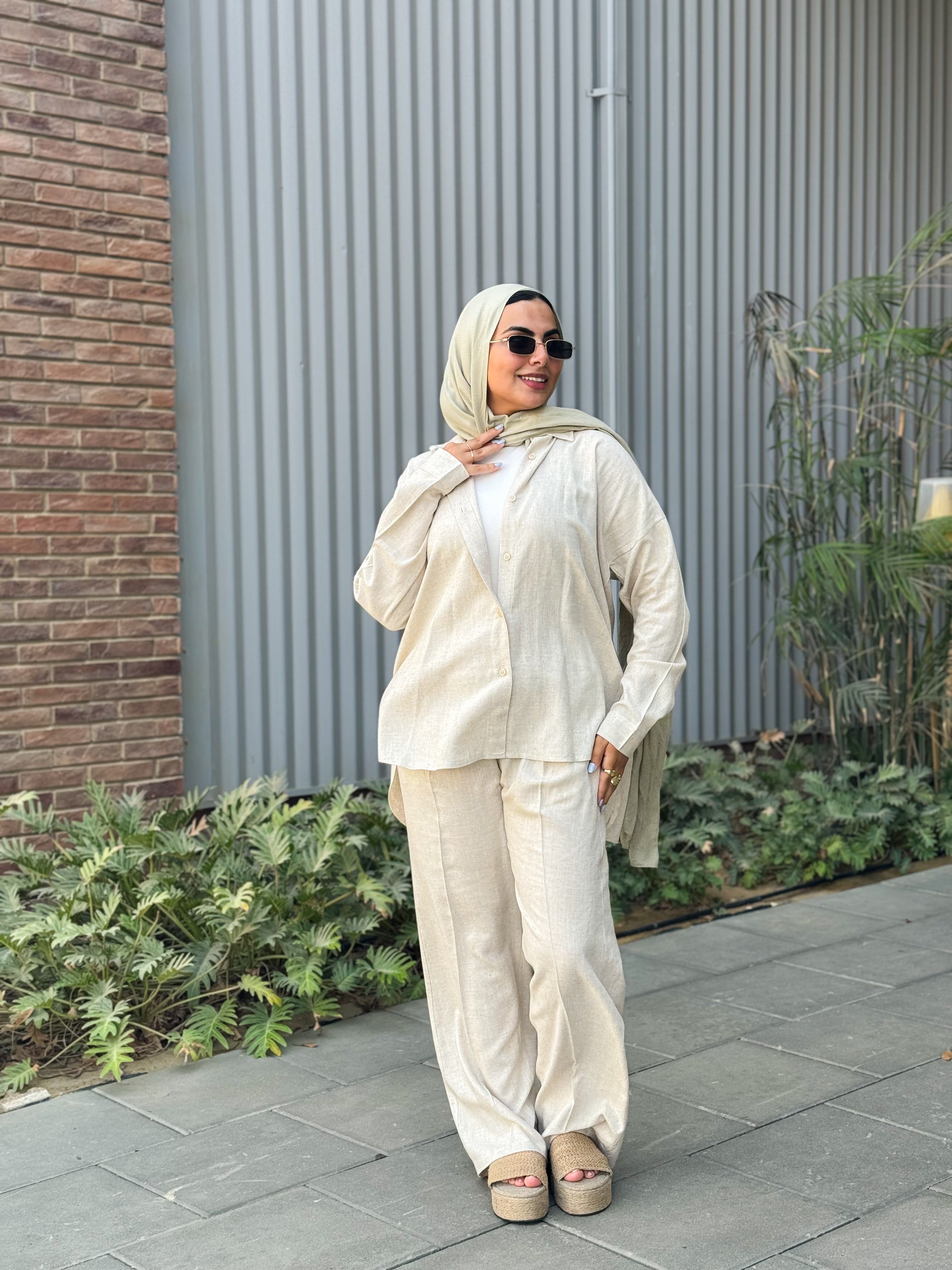 Redefining everyday elegance, this two-piece set features a relaxed-fit chemise with a subtle side button detail that cinches the waist for a naturally draped, flattering silhouette paired with precision-cut tailored trousers—crafted for the modern woman who values both comfort and structure.