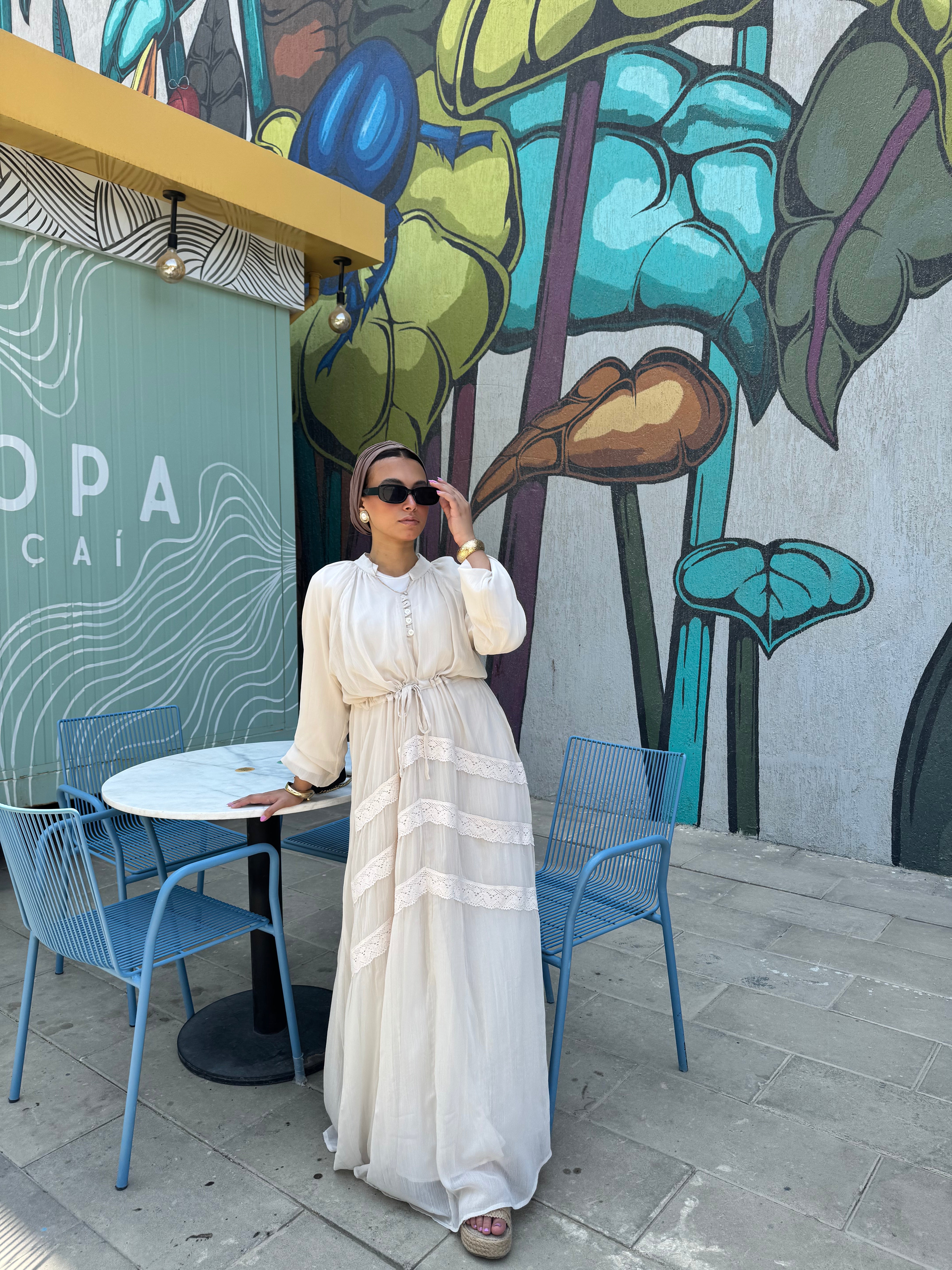 Billowy and romantic, this maxi dress with slightly oversized silhouette Features: Button-up notched around neckline, puffed sleeves, asymmetrical hemline design, tie closure at waist, embroidered lace paneling; With endless ways to wear it.